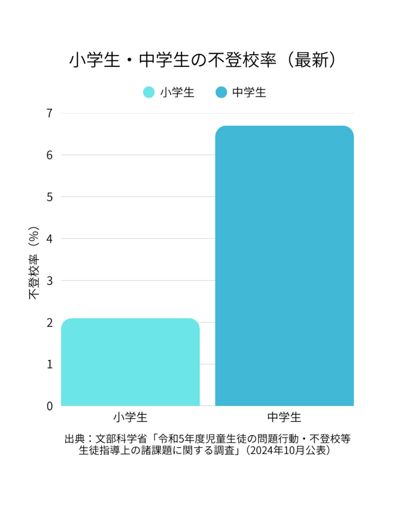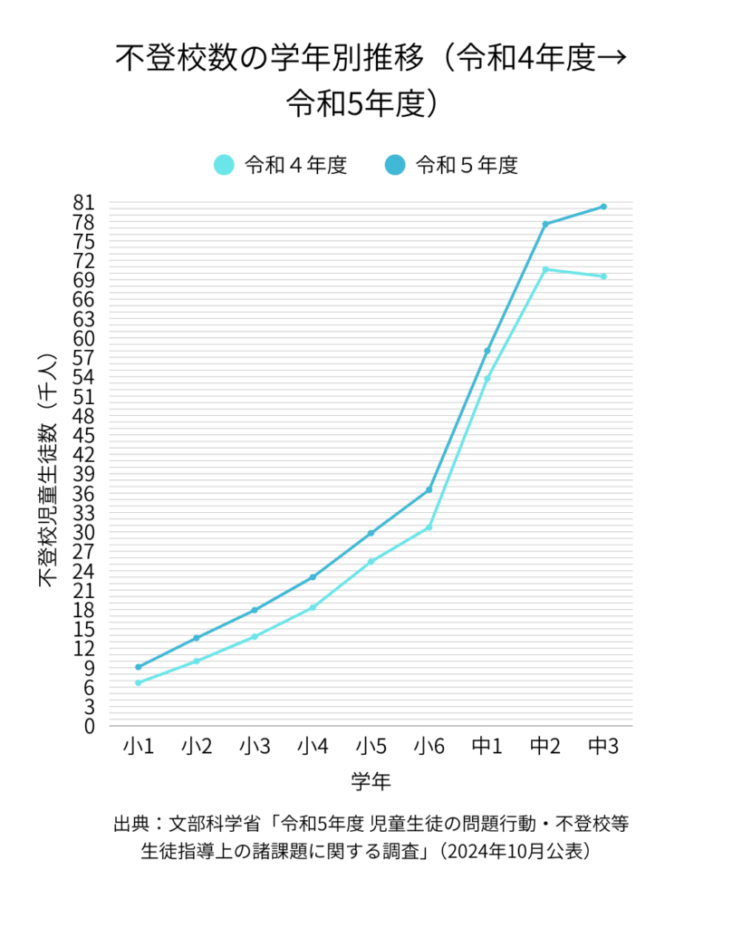 中学校では1クラスに2〜3人が不登校状態という計算になり、これは決して「特別なケース」ではないことを示しています。
