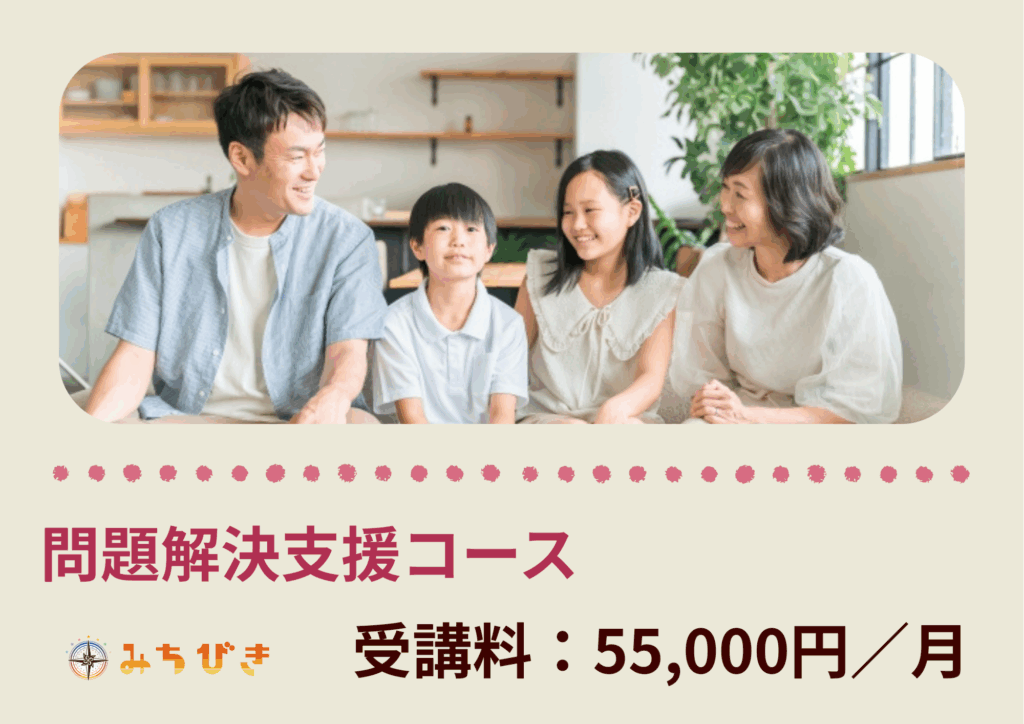 みちびきの「問題解決支援コース」は、そのような深刻な悩みを抱えたご家庭のための特別な支援コースです。ただ気持ちを整理するだけではなく、「変わるために動く」「現実を変えていく」ための具体的で実践的な支援を提供します。